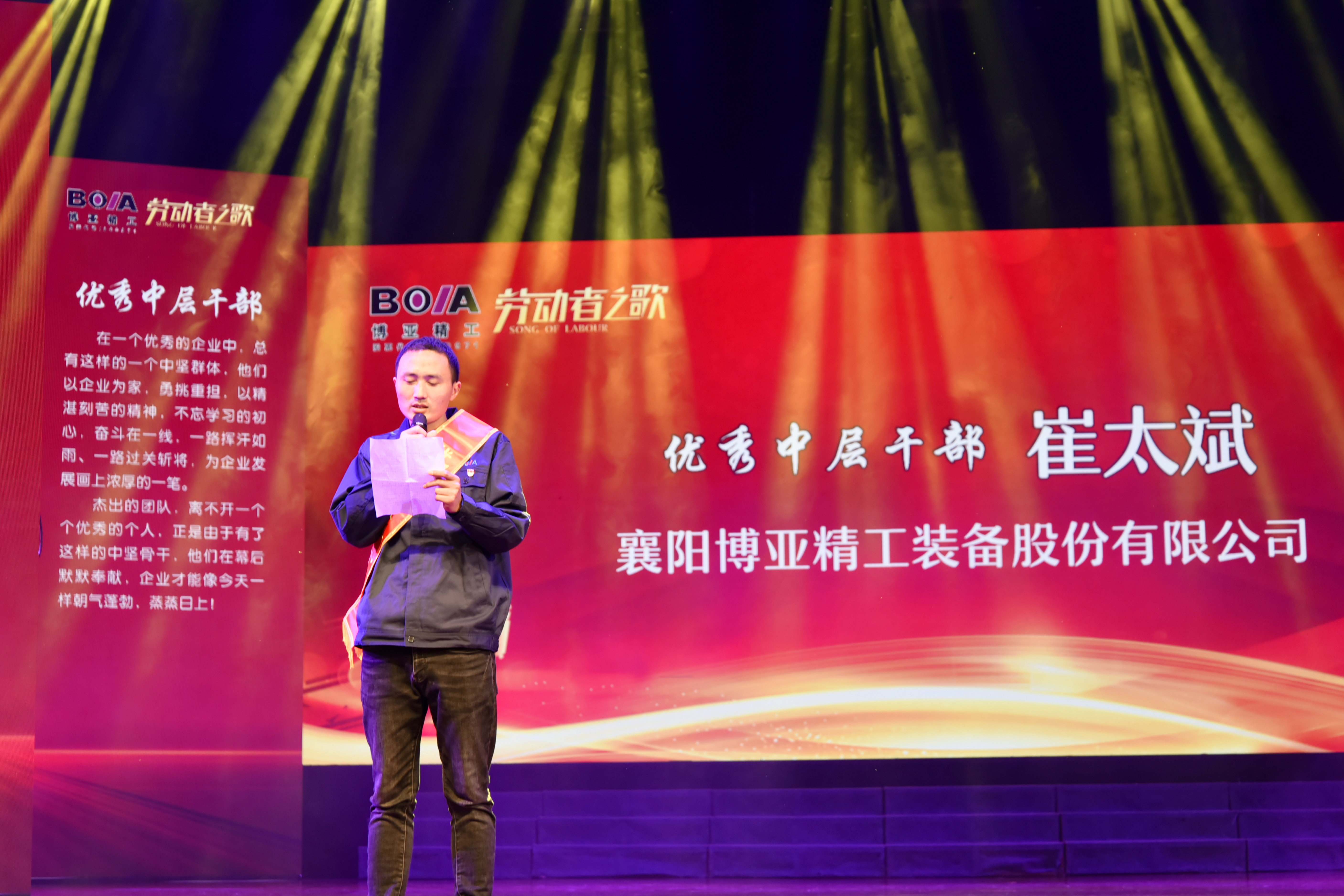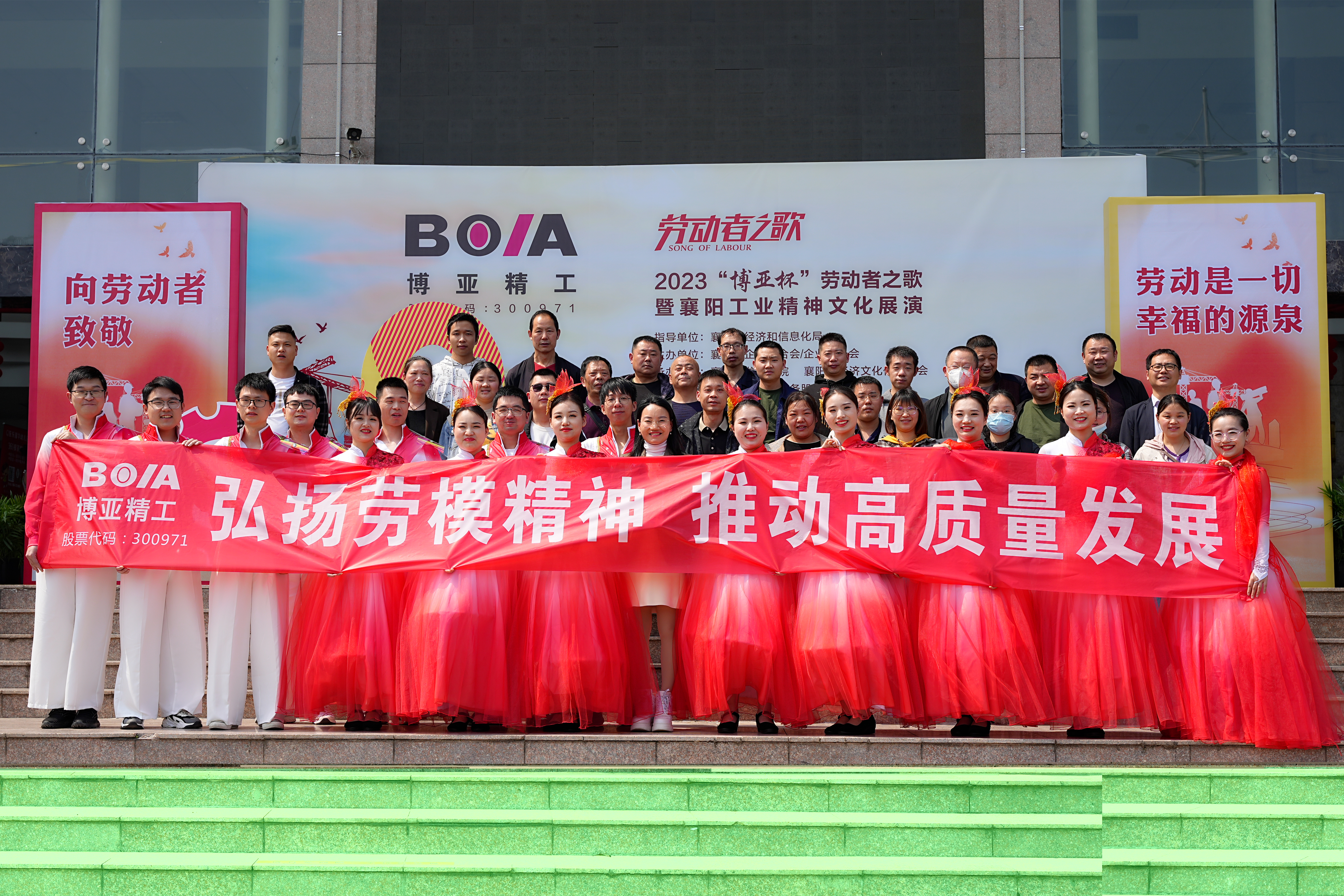 用汗水書寫歷史,用勞動(dòng)奏響贊歌。2023年4月27日下午,經(jīng)市委市政府批準(zhǔn),在市經(jīng)信局指導(dǎo)下,由公司冠名贊助舉辦的第五屆“博亞杯”勞動(dòng)者之歌暨襄陽工業(yè)精神文化展演活動(dòng),在襄陽劇院隆重舉行。襄陽市政府黨組成員張方晶,市人大常委會(huì)副主任王紹玲,市政府副秘書長潘峰,市委組織部、市委宣傳部、市委統(tǒng)戰(zhàn)部、市委人才辦、市經(jīng)信局、市人社局、市科技局、市總工會(huì)、市工商聯(lián)、市文明辦、襄陽日?qǐng)?bào)社、襄陽電視臺(tái)、市中小企業(yè)發(fā)展服務(wù)中心等市直有關(guān)部門和相關(guān)單位的領(lǐng)導(dǎo),襄陽市企聯(lián)、市各商協(xié)會(huì)和百強(qiáng)企業(yè)代表及嘉賓蒞臨出席活動(dòng)。公司董事、財(cái)務(wù)總監(jiān)康曉莉出席活動(dòng)并上臺(tái)致辭。