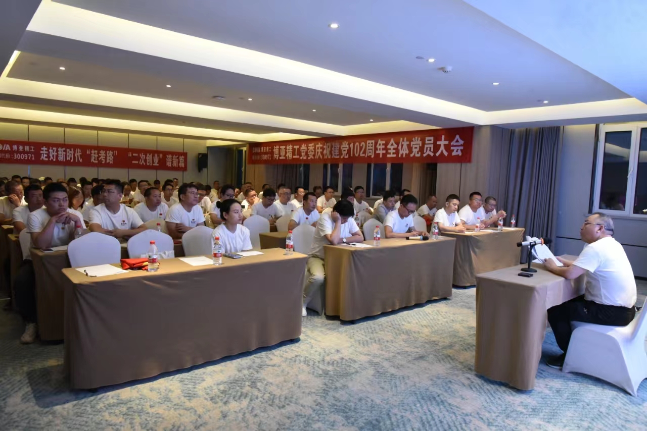 當(dāng)天晚上,在住宿酒店會(huì)議室組織召開了“慶祝建黨102周年全體黨員大會(huì)”。會(huì)議舉行了老黨員重溫入黨誓詞和預(yù)備黨員入黨宣誓儀式,黨委書記李總給預(yù)備黨員發(fā)放了《黨章》和《政治生日賀卡》。在會(huì)上表彰了公司2022—2023年度優(yōu)秀共產(chǎn)黨員,杜紅波、周微、馮攀、李波、劉軍5名同志獲此殊榮。隨后優(yōu)秀黨員代表劉軍作了表態(tài)發(fā)言,公司黨委委員輪流圍繞各自分管黨務(wù)工作談了認(rèn)識(shí)和體會(huì)。最后,黨委書記李總以《不忘“兩個(gè)務(wù)必”、牢記“三個(gè)務(wù)必”,奮力譜寫博亞“二次創(chuàng)業(yè)”新的絢麗華章,爭做市場(chǎng)經(jīng)濟(jì)條件下的道德模范》為題向大家講授了專題黨課。